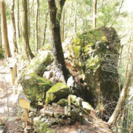 天狗が登ったとされる大きな石は、崖から落ちそうで「落ちない