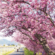 毎年2月上旬から3月上旬にかけて朝比奈川左岸堤防の桜並木が見頃を迎えます。「焼津市山の手未来の会」が、寄付を受けた40本から接ぎ木育成した河津桜を、平成10年から堤防沿いに10m間隔で2㎞にわたって200本植えました。