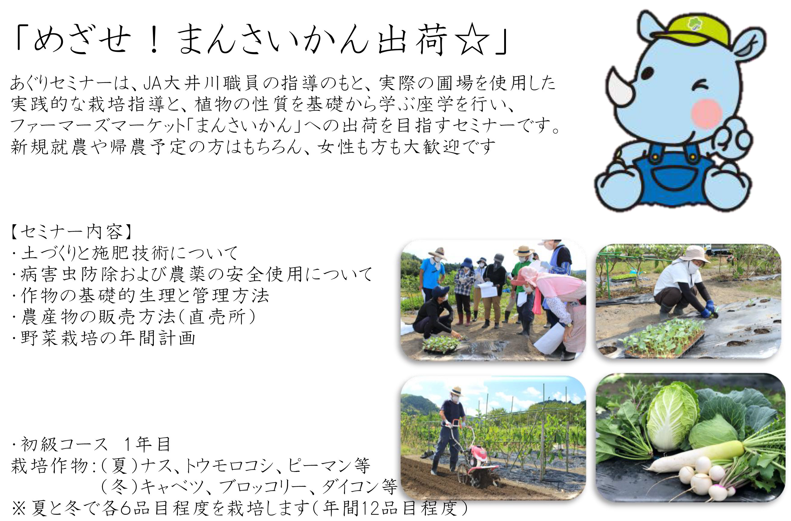 あぐりセミナーでは、新規就農者の育成や帰農支援を通じて、ファーマーズマーケットへの出荷者を育成していきます。実際に野菜づくりを圃場で行い、栽培方法や肥料農薬・農機具の使い方などを学んでいただけます。