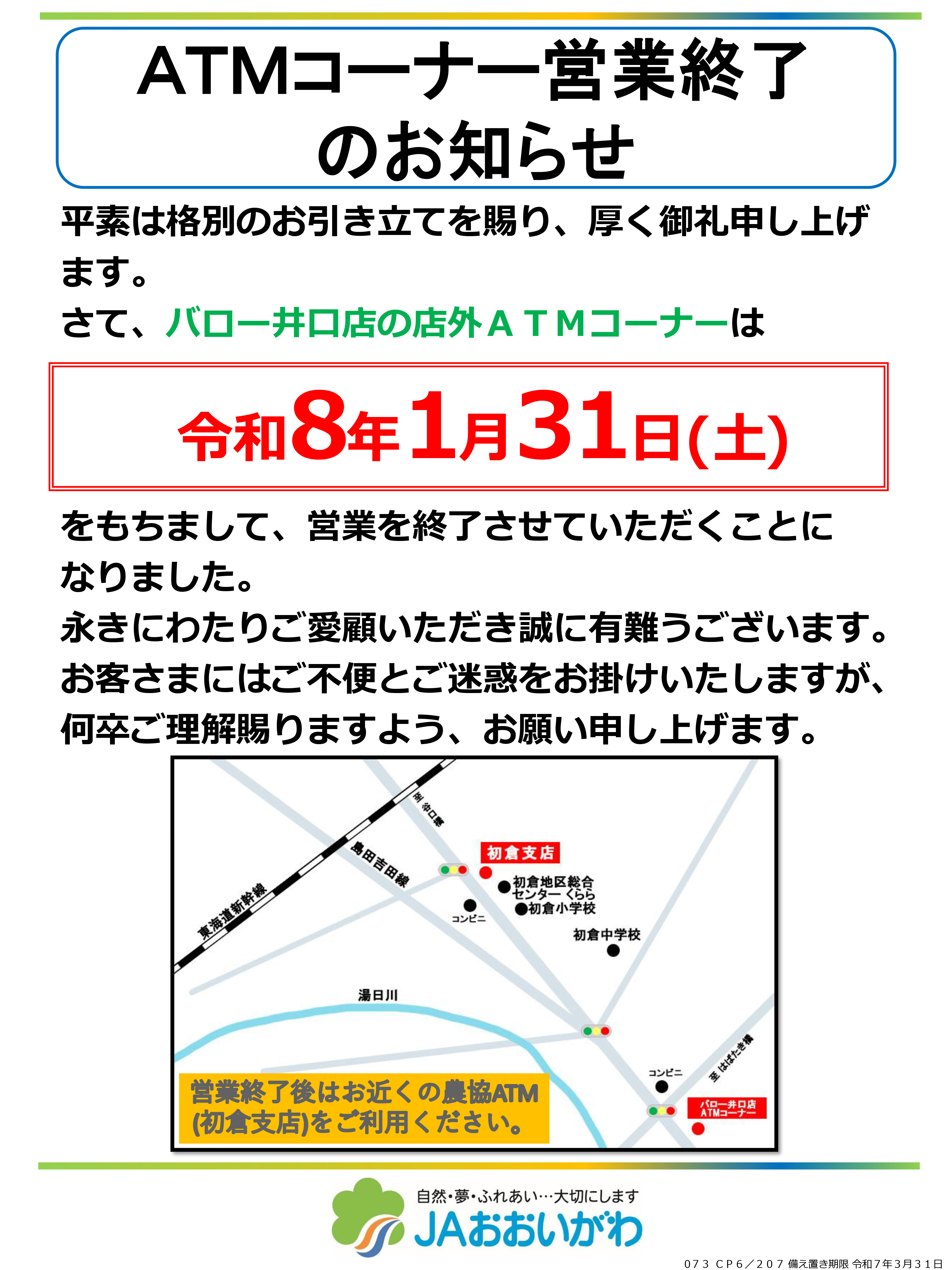 「バロー井口店」ATMコーナー営業終了のお知らせ
