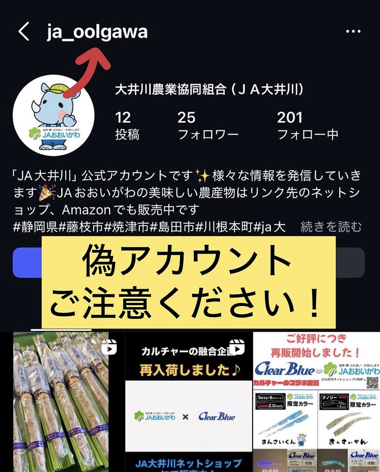 この度、Instagramにて大井川農業協同組合【JA大井川】の偽アカウントが作成されている事案が発見されました。