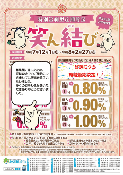 ご好評をいただいておりました特別金利型定期貯金「笑ん結び」につきましては、募集総額に達しましたため、誠に勝手ながら振替契約のお申し込み受付を終了させていただきました。