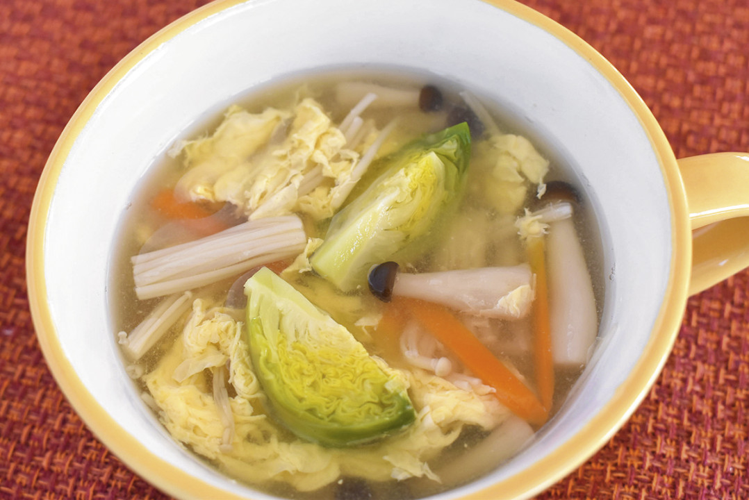 ②小鍋にだし汁と芽キャベツ、ニンジン、シメジ、エノキを入れ火にかけて、沸騰したら中火で3分煮ます。
