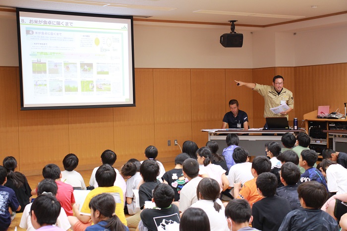 授業では、JA職員が講師となり、米の栄養や歴史のほか、米農家が直面している問題を子供たちに伝えました。