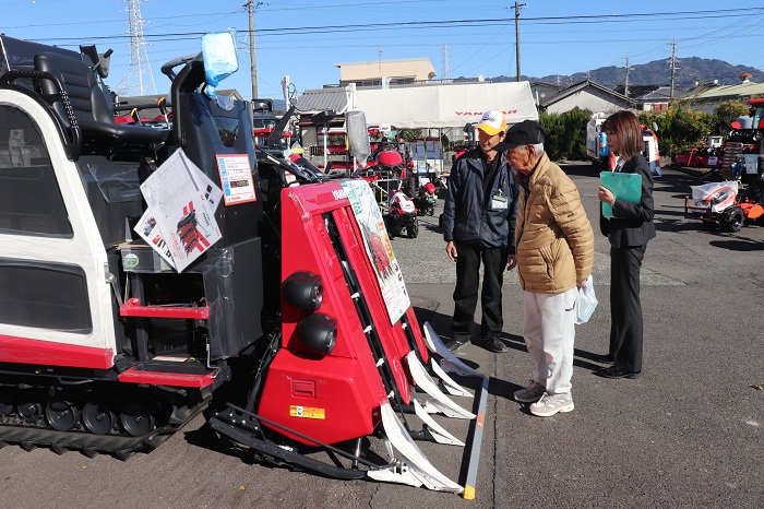 JA大井川東部農機センターは11月28日・29日、同センターで農業機械展示会を開きました。最近の米価格上昇を背景に農業機械や設備の更新意欲が高まる中、メーカーも受注増で納期が長期化しているため、展示会を契機に組合員の更新ニーズを高め来年の農作業に間に合うよう対応することが狙いです。
